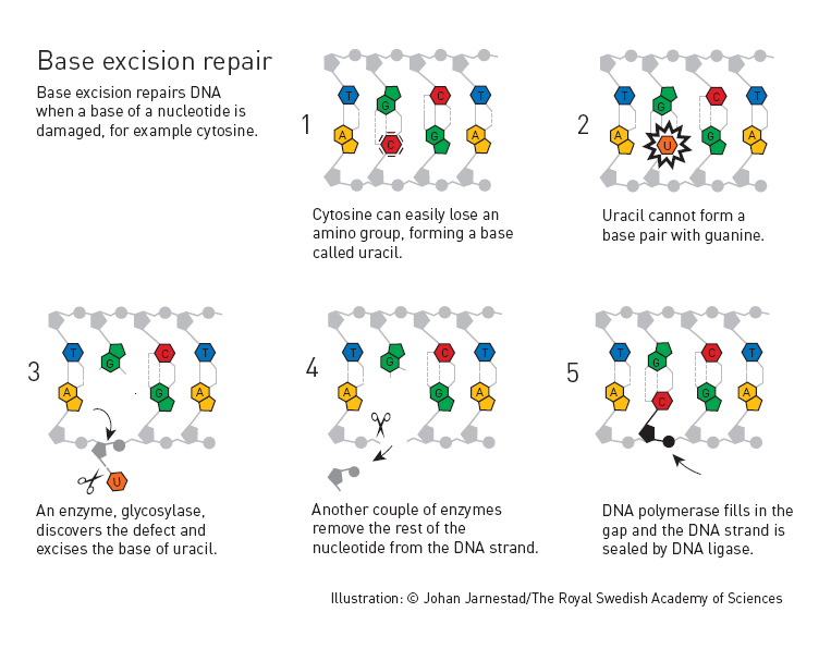 Base excision repair also occurs in human beings and, in 1996, Tomas Lindahl managed to recreate the human repair process in vitro.